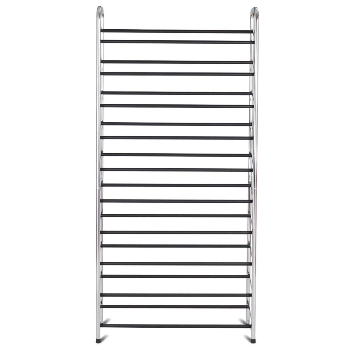 Made of steel pipe, this shoe rack is durable and has a stable construction. This shoe rack has ten tiers, so totally can hold 50 pairs normal shoes, providing large space to store your shoes and saving space. This ten-tier shoe rack is really practical and useful. It is a good shoes holder and space organizer that can help you make your room become neater.