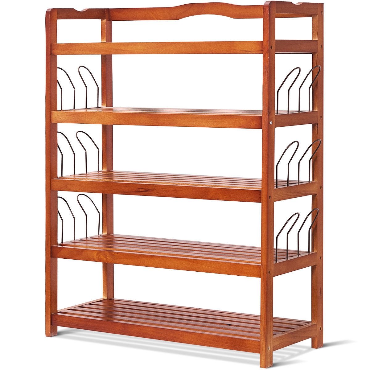 5-Tier Wooden Entryway Storage Shoe Rack w/ 6 Shoe Stretcher-Wood