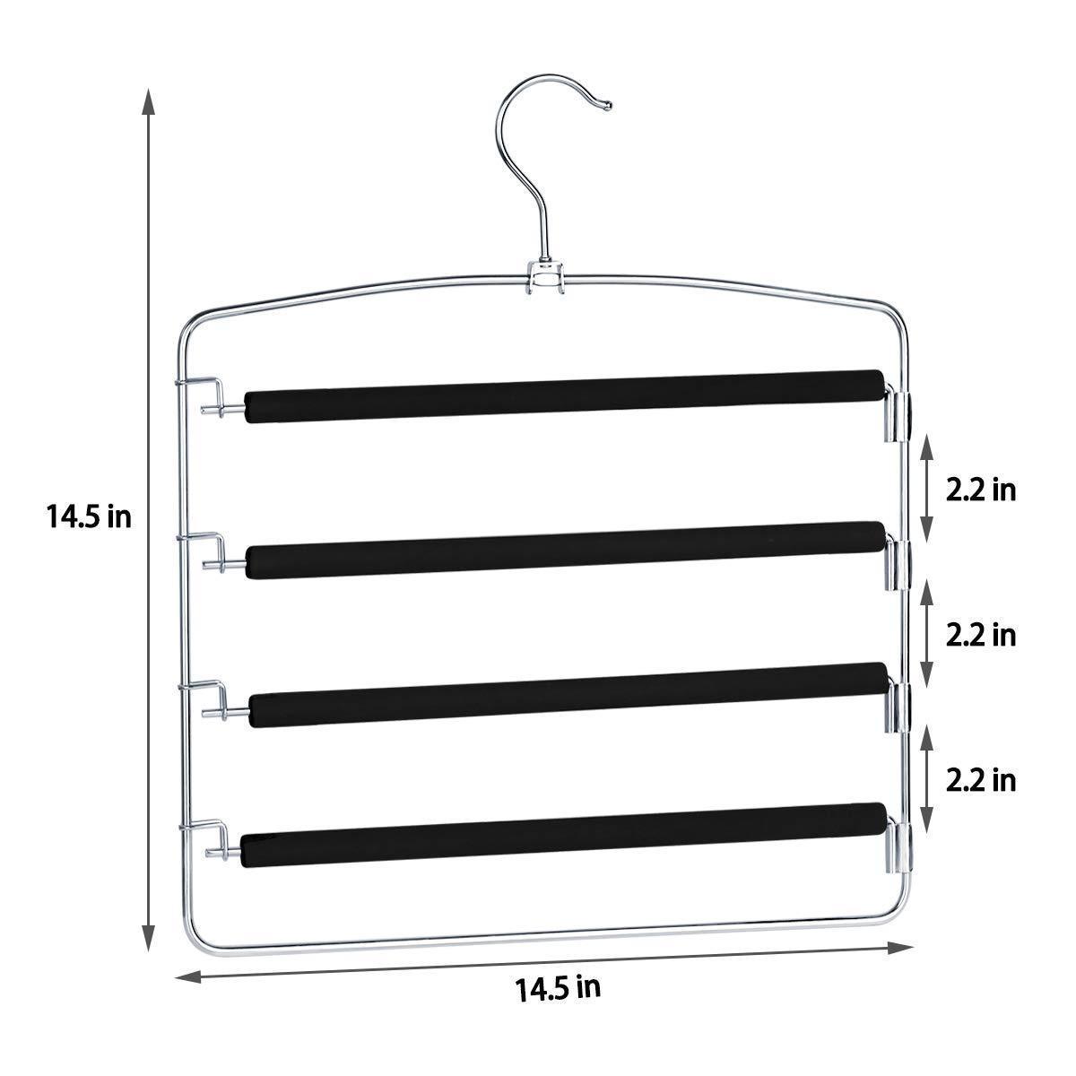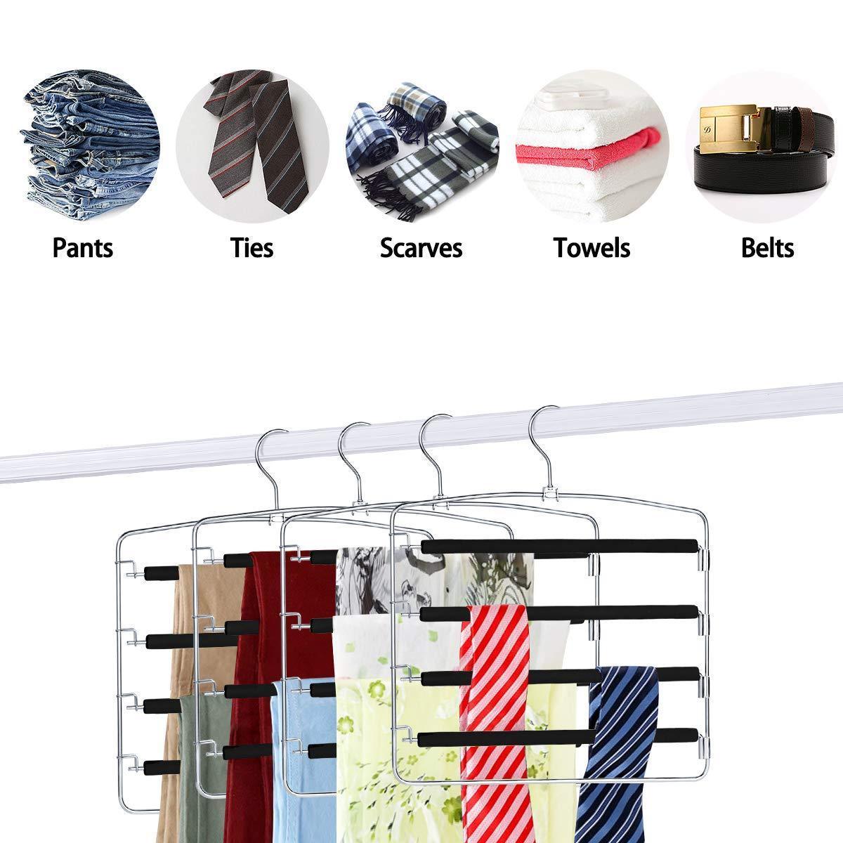Pack of 4 Non-Slip Pants Hangers Stainless Steel Slack Hangers Space Saving Clothes Hangers Closet Organizer with Foam Padded Swing Arm, Multi Layers & Rotatable Hook