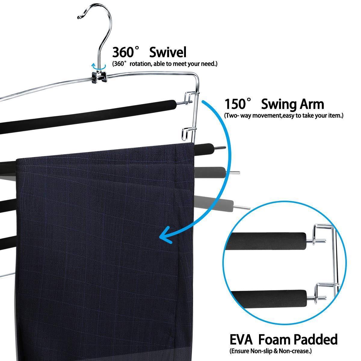 - ?Swing Arms:Four Swing Arms 150 degree and swing out individually. You can hang up and take off the slacks you want with ease. Also with rotatable collapsible hook, makes the hanger the greast closet organizer hanger.