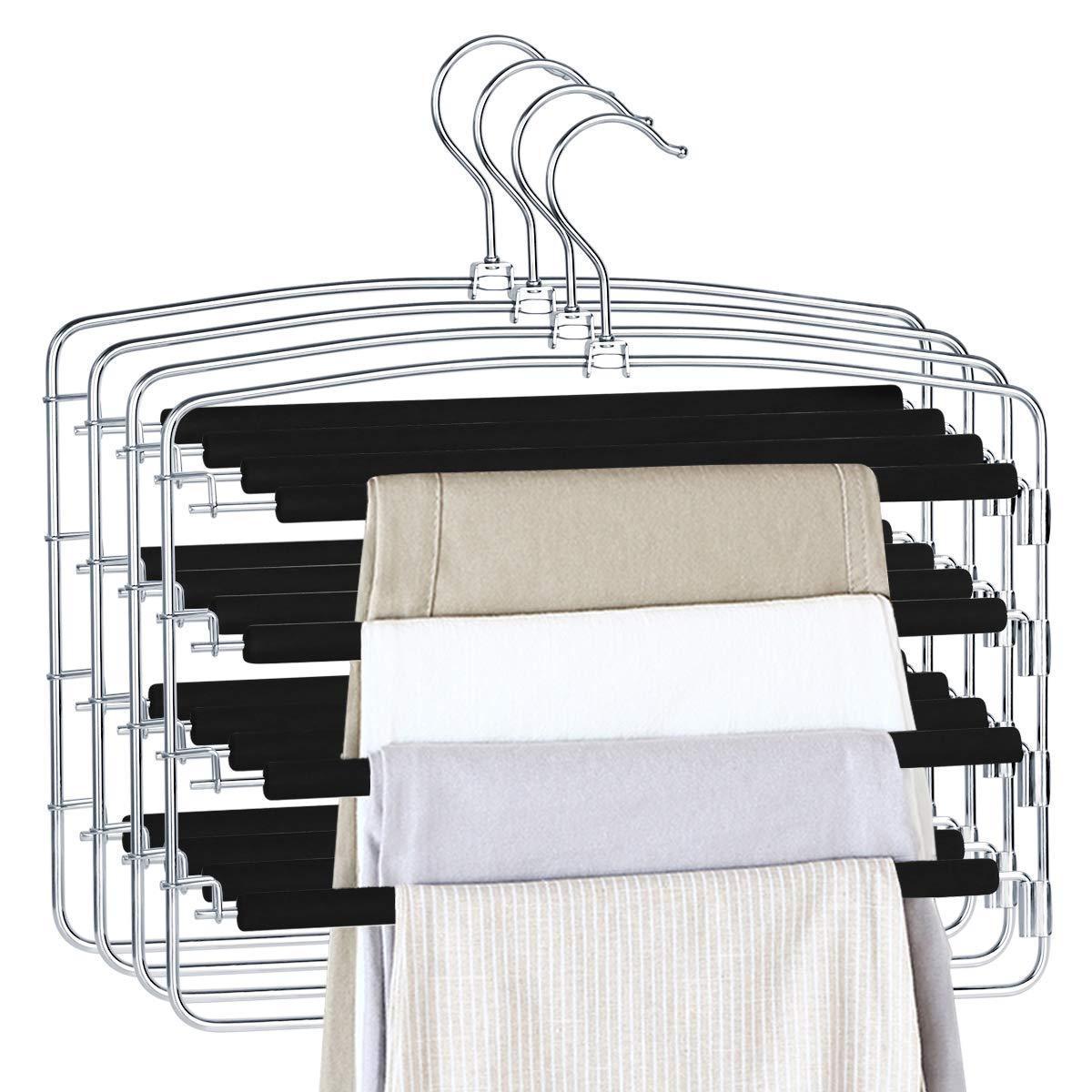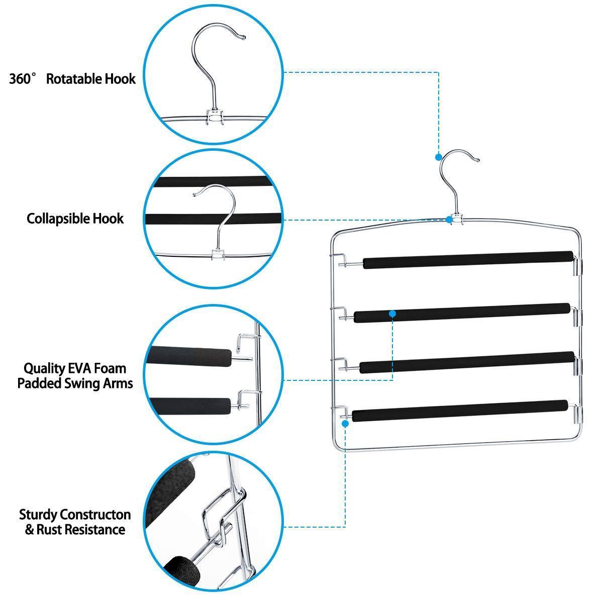Pack of 4 Non-Slip Pants Hangers Stainless Steel Slack Hangers Space Saving Clothes Hangers Closet Organizer with Foam Padded Swing Arm, Multi Layers & Rotatable Hook