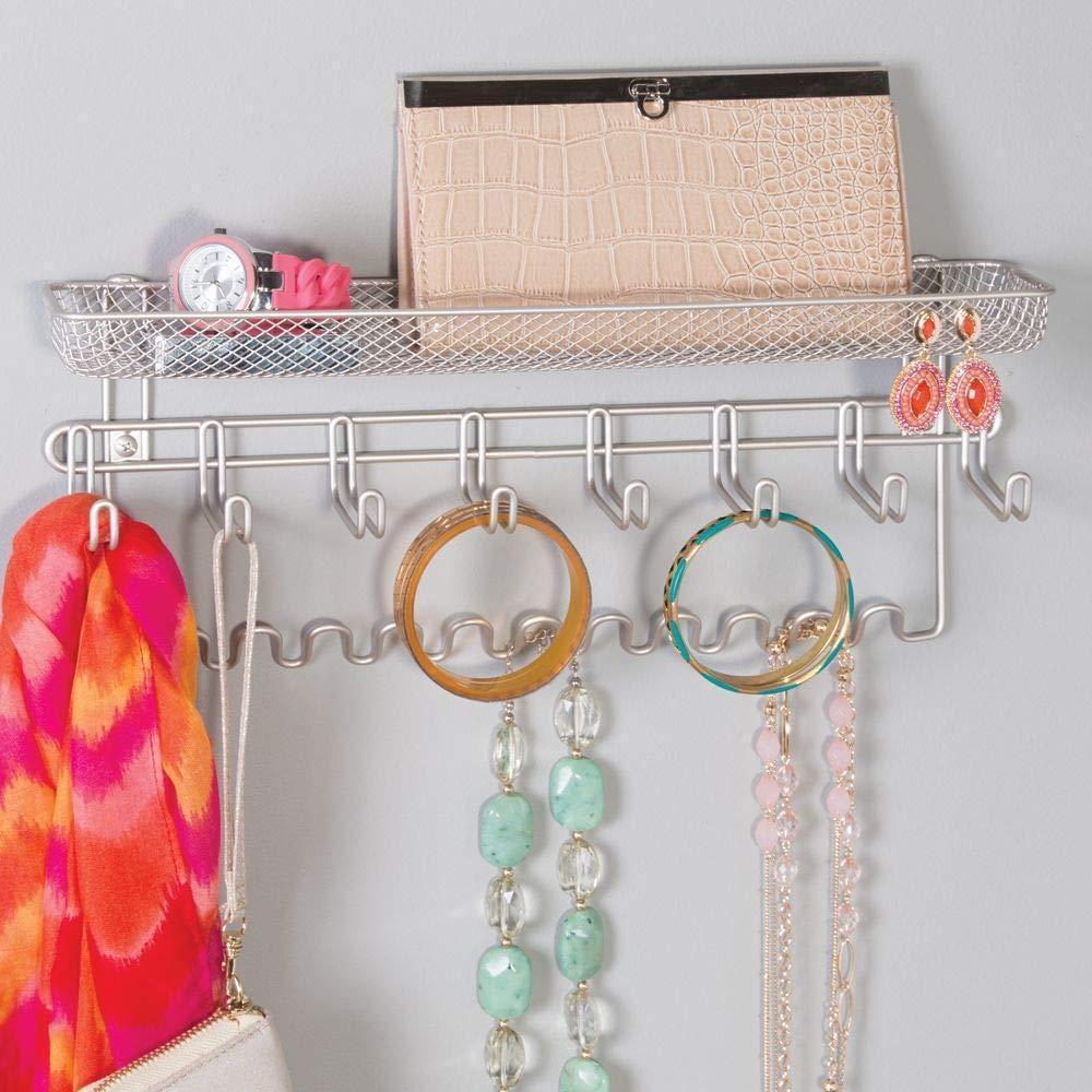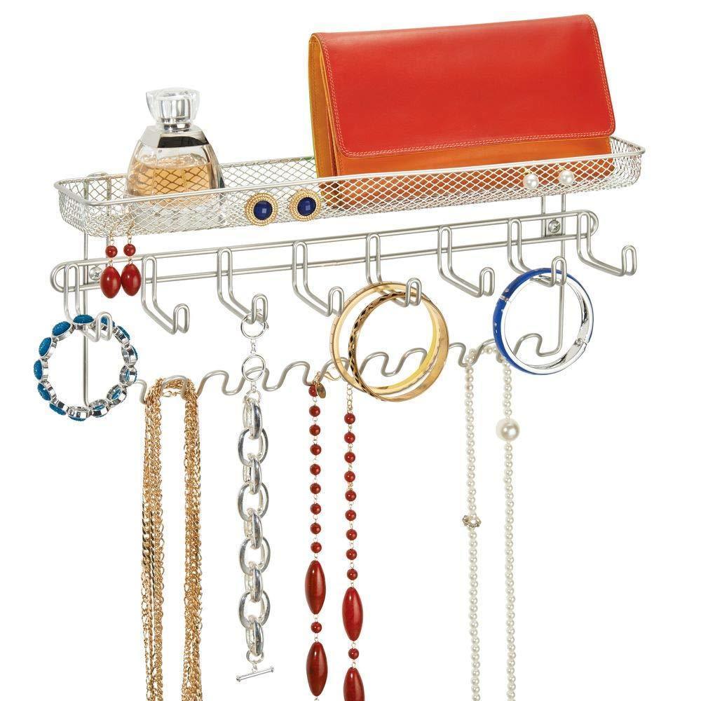 Details: Keep your jewelry and accessories neatly organized with the Closet Wall Mount Jewelry Organizer from . Eight large hooks make it easy to store bracelets and larger costume jewelry while 11 smaller hooks hold necklaces. The attached basket holds rings, hair accessories, cosmetics, makeup and more in one convenient spot. The organizer easily installs with the included hardware to closet, bathroom, or bedroom walls.