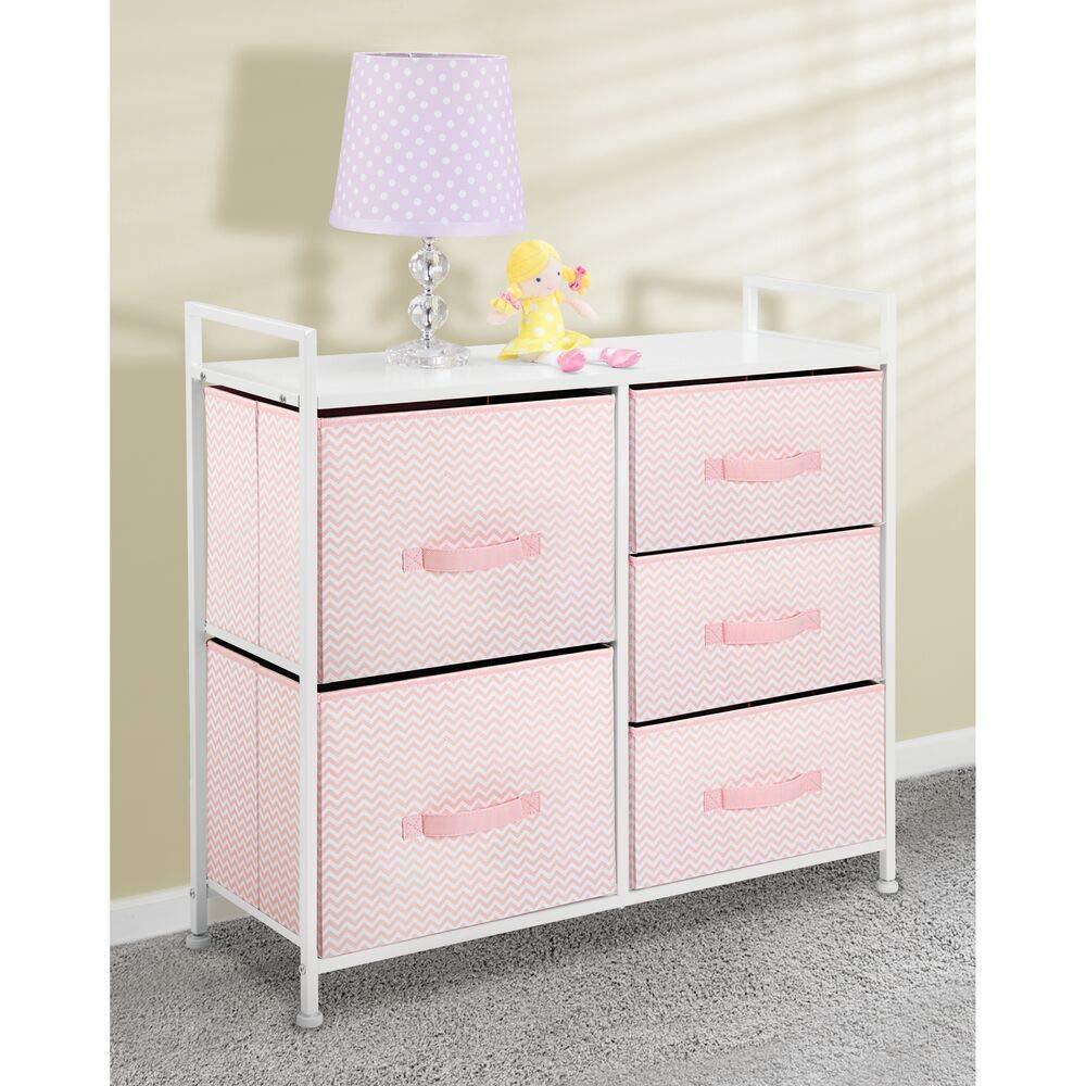 Details: Create stylish storage with this Five Drawer Vertical Dresser Storage Cabinet from . The organizer separates and stores all of your wardrobe and linen essentials, and make it easy to find and grab what you need right away. Five removable drawers separate and organize clothing and accessories like hats, socks and shoes, scarves, blankets and more in one convenient place. They offer roomy space for storing out of season clothing, shoes, purses, scarves, bedding, linens, and more. The fun colors and modern zig-zag geometric pattern works well for kids and adults and adds stylish storage to any bedroom closet, laundry area or other storage space in your home, and a wood top provides a hard surface to place lamps, accessories, home decor and more.
