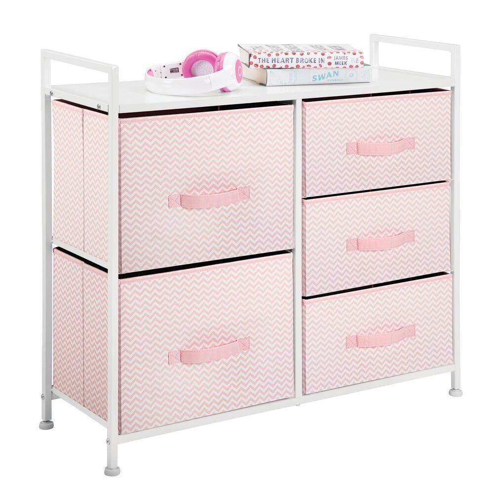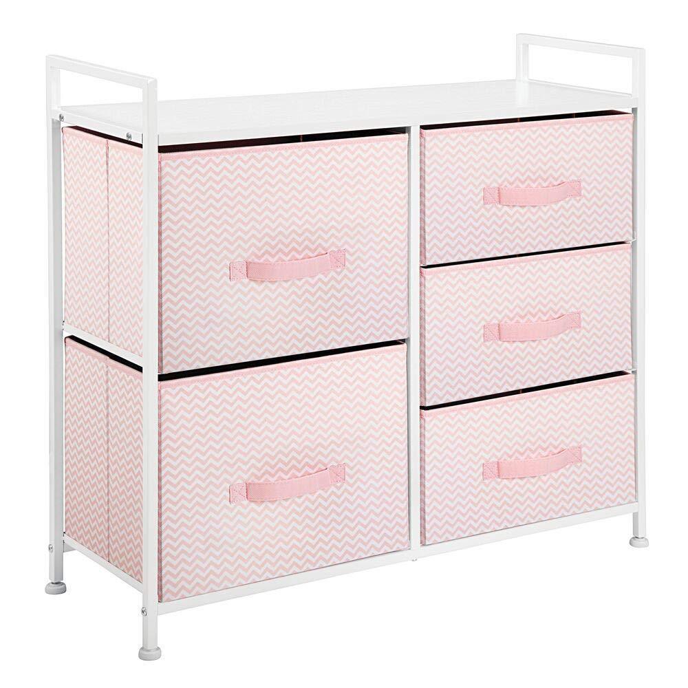 Wide Dresser Storage Tower Furniture - Metal Frame, Wood Top, Easy Pull Fabric Bins - Organizer for Kid's Bedroom, Hallway, Entryway, Closets, Dorm - Chevron Print, 5 Drawers - Pink/White