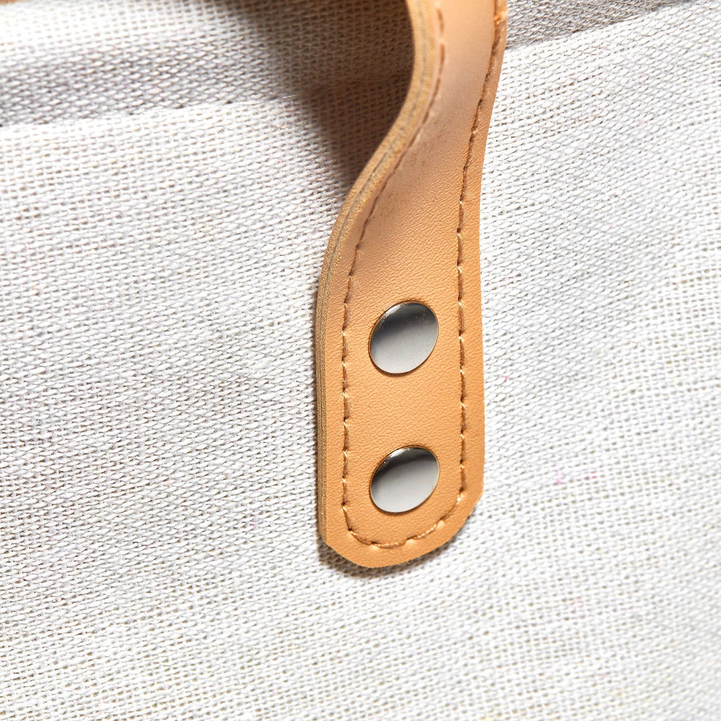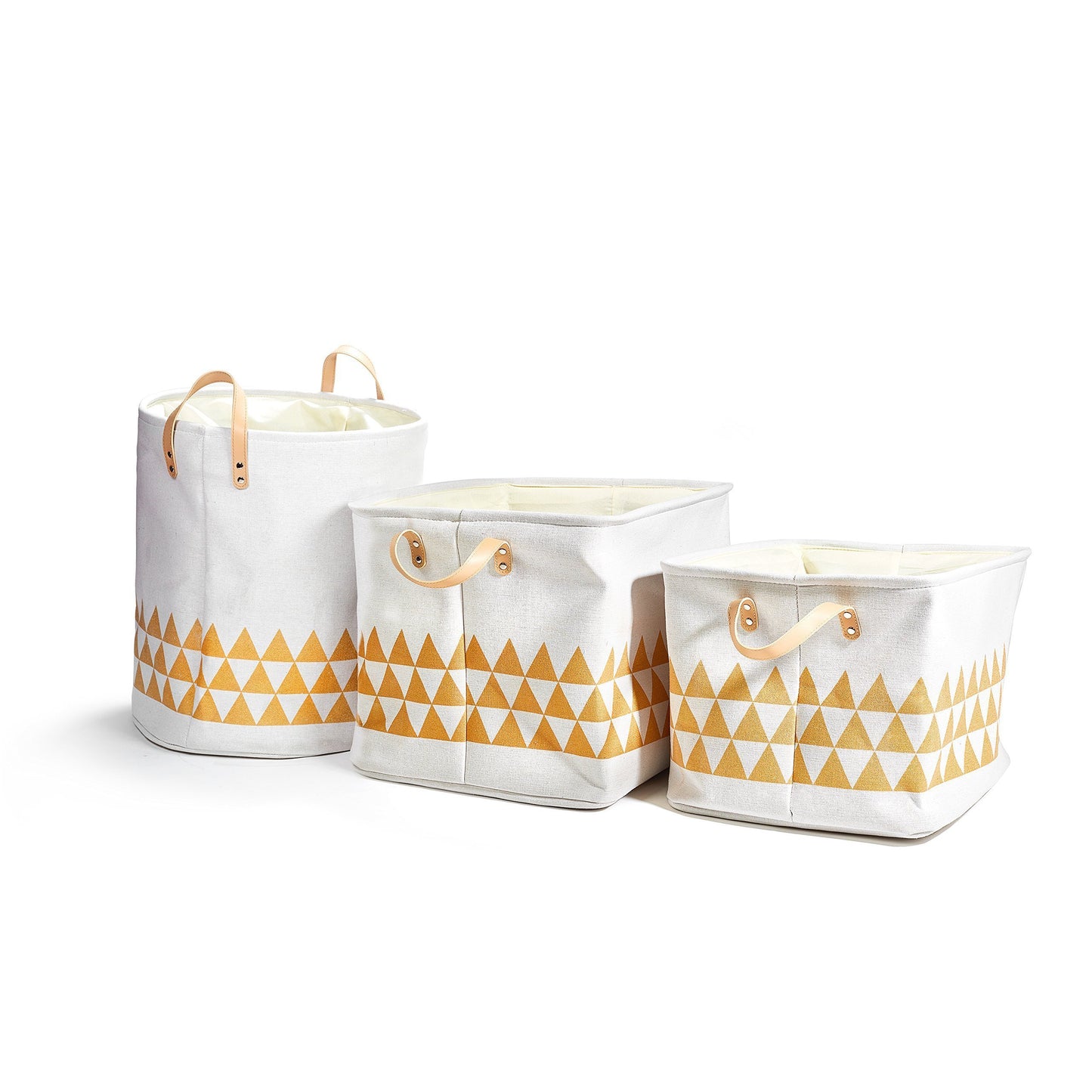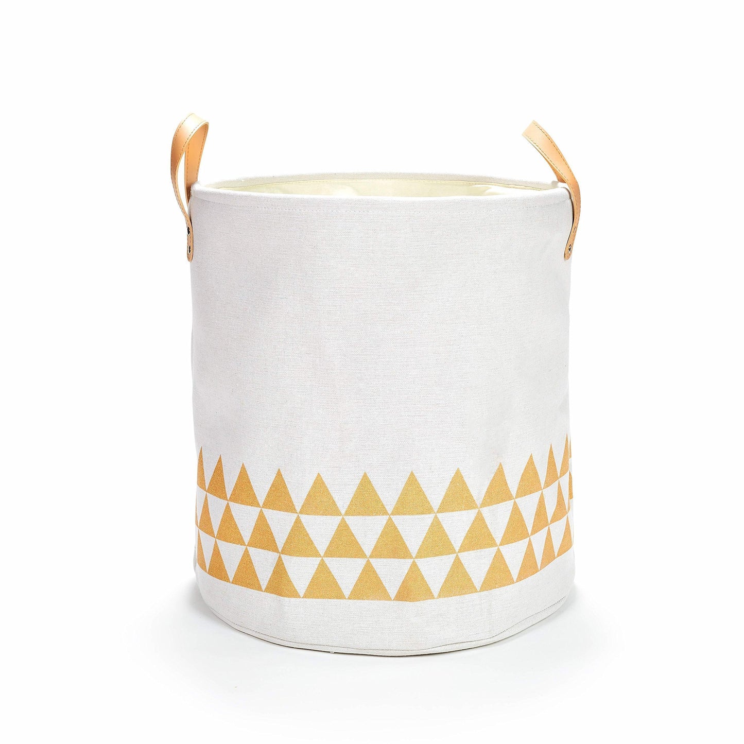 Details: Yascent Collapsible Polyester Storage Basket or Bin with Durable Leather Handles, Home Organizer Solution for Office, Bedroom, Closet, Toys, & Laundry, Round, Cream White with Golden Triangle
